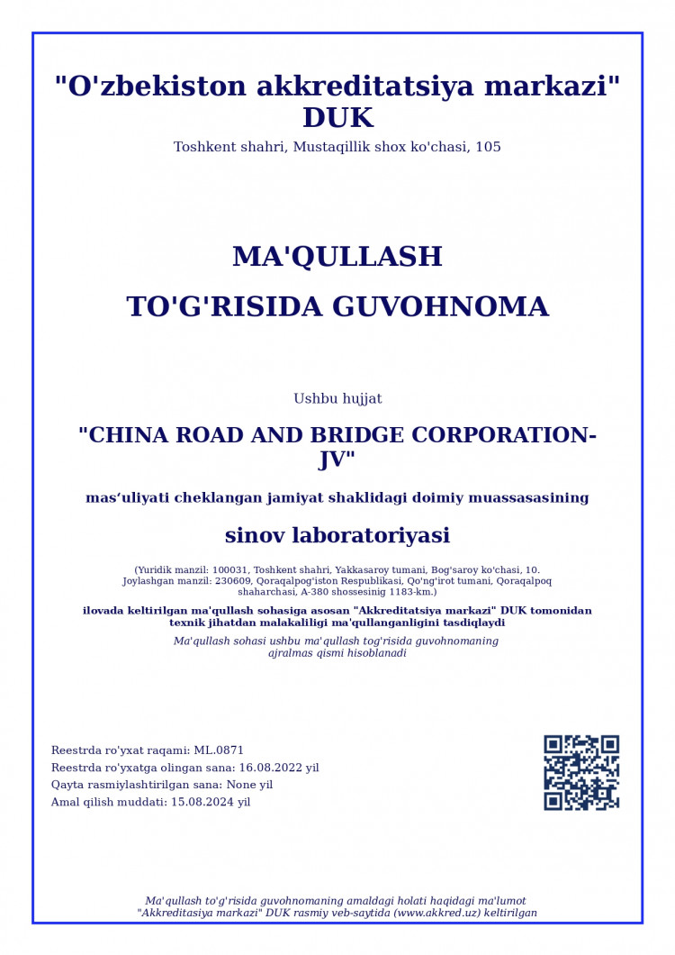 ООО "ILM STANDART" подготовила очередную строительную испытательную лабораторию "CHINA ROAD AND BRIDGE CORPORATION-JV" для прохождении одобрении.